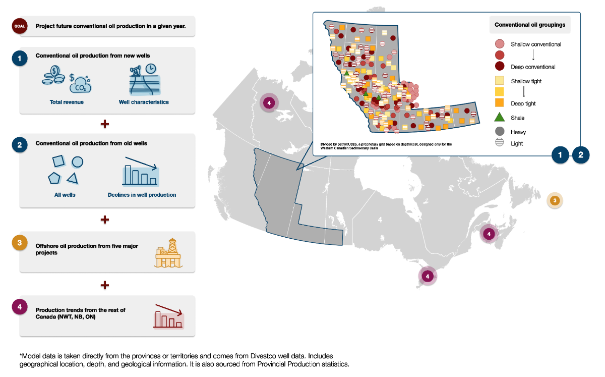 Description: This infographic provides a visual overview of the model used to project total Canadian conventional, tight, and shale oil production in a given year. The model components include: