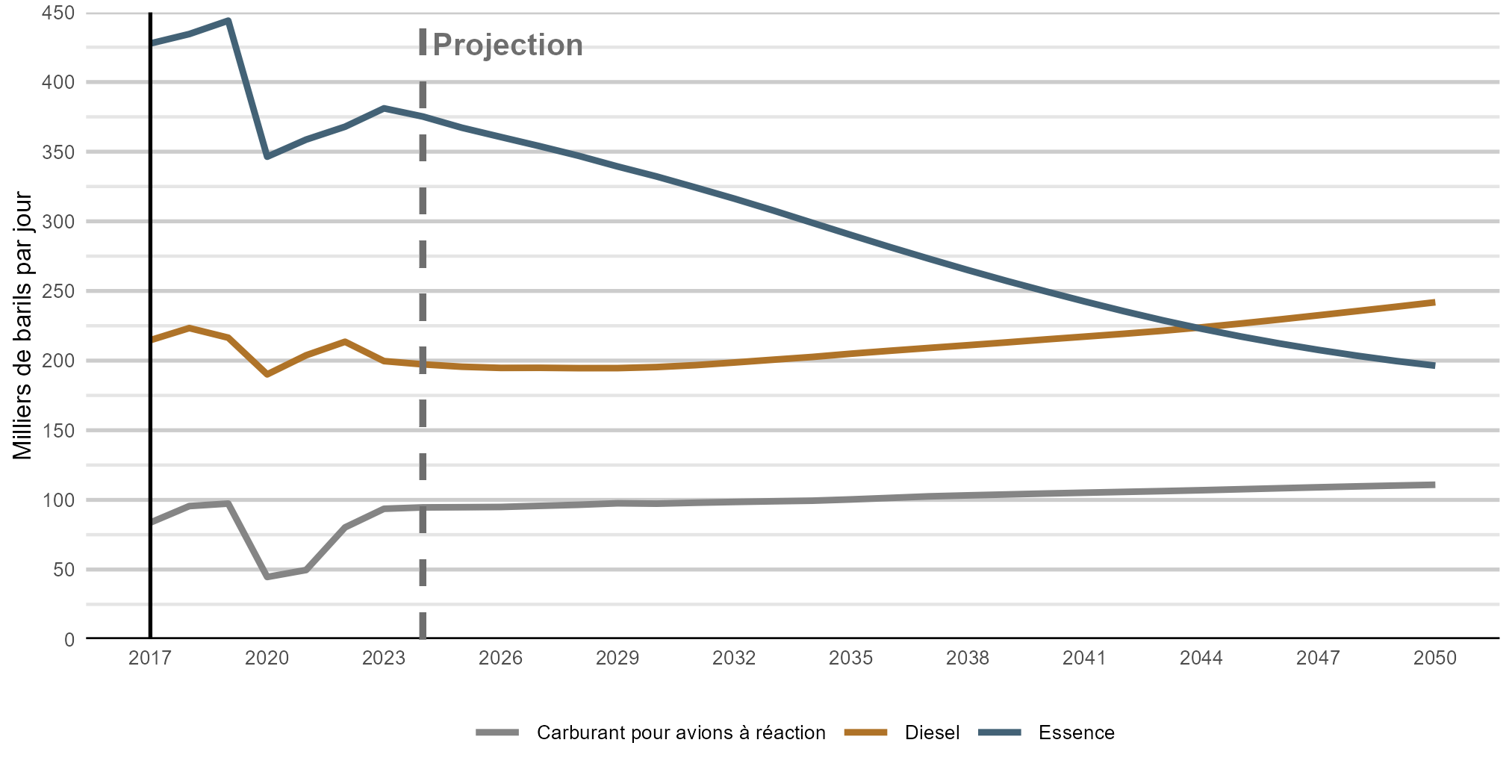 Version texte : Ce graphique linéaire illustre la demande combinée d’essence, de diesel et de carburéacteur en Ontario et au Québec, de 2017 à 2050, dans le scénario des mesures actuelles. La demande d’essence diminue de façon constante tout au long de la période de projection. La demande de diesel reste relativement stable au début de la période de projection, puis augmente progressivement vers le milieu du siècle. Celle de carburéacteur, après une chute brusque vers 2020 (pandémie de COVID-19), se rétablit et augmente lentement jusqu’à la fin de la période de projection.
