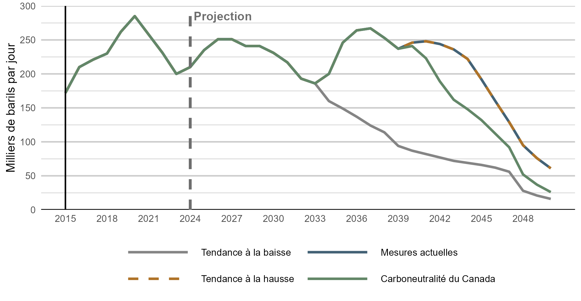 Version texte : Ce graphique linéaire illustre la production de pétrole brut de Terre-Neuve-et-Labrador, de 2015 à 2050, dans les quatre scénarios. La production suit la même trajectoire dans tous les scénarios jusqu’au début des années 2030, augmentant à court terme et atteignant presque un sommet au milieu des années 2030 dans les scénarios de carboneutralité du Canada et de la tendance à la hausse. Par la suite, les scénarios divergent. La production demeure la plus élevée dans le scénario de la tendance à la hausse, diminue plus modérément dans les scénarios des mesures actuelles et de carboneutralité du Canada, et recule plus fortement dans le scénario de la tendance à la baisse à l’horizon 2050.