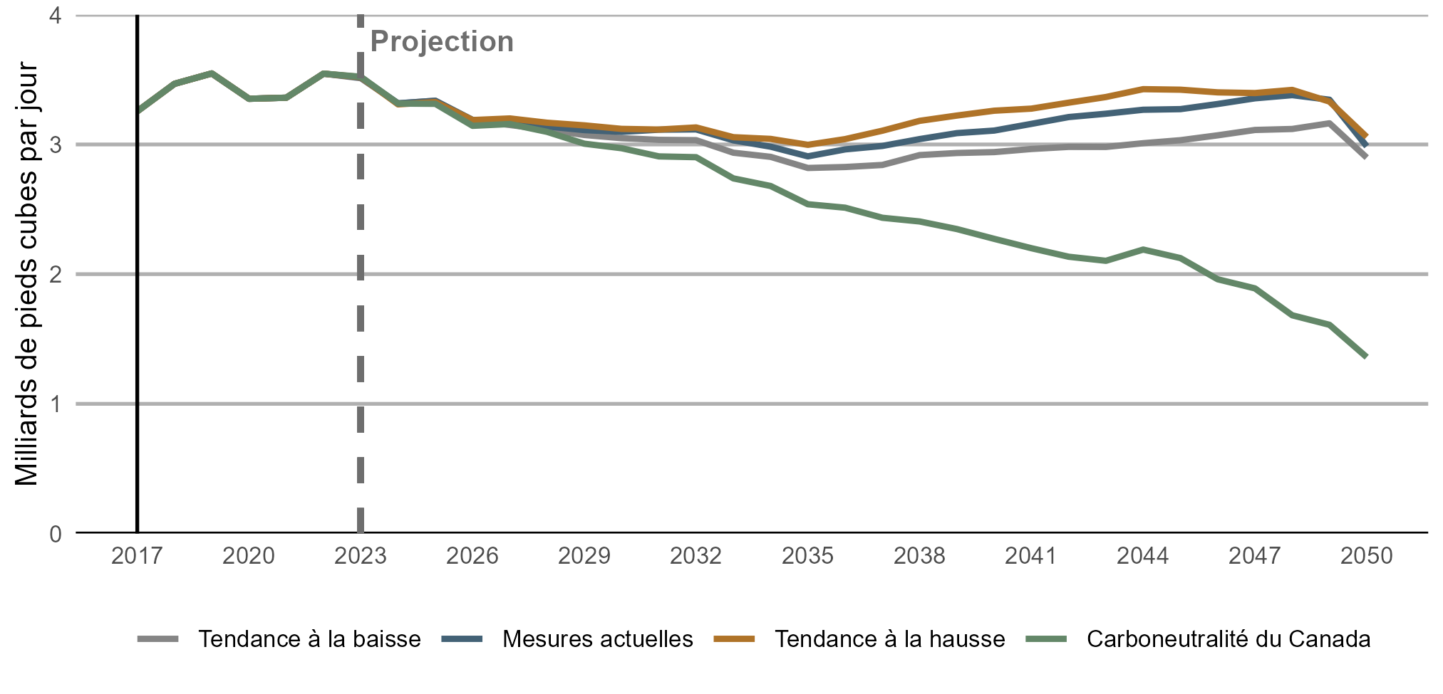 Dans tous les scénarios, la production canadienne de gaz naturel demeure suffisamment élevée pour répondre à la consommation future du pays. La production, qui s’établissait à 18 Gpi³/j en 2024, augmente dans tous les scénarios, culminant à 31 Gpi³/j dans le scénario de la tendance à la hausse à l’horizon 2050 et chutant à 21 Gpi³/j dans le scénario de carboneutralité du Canada.