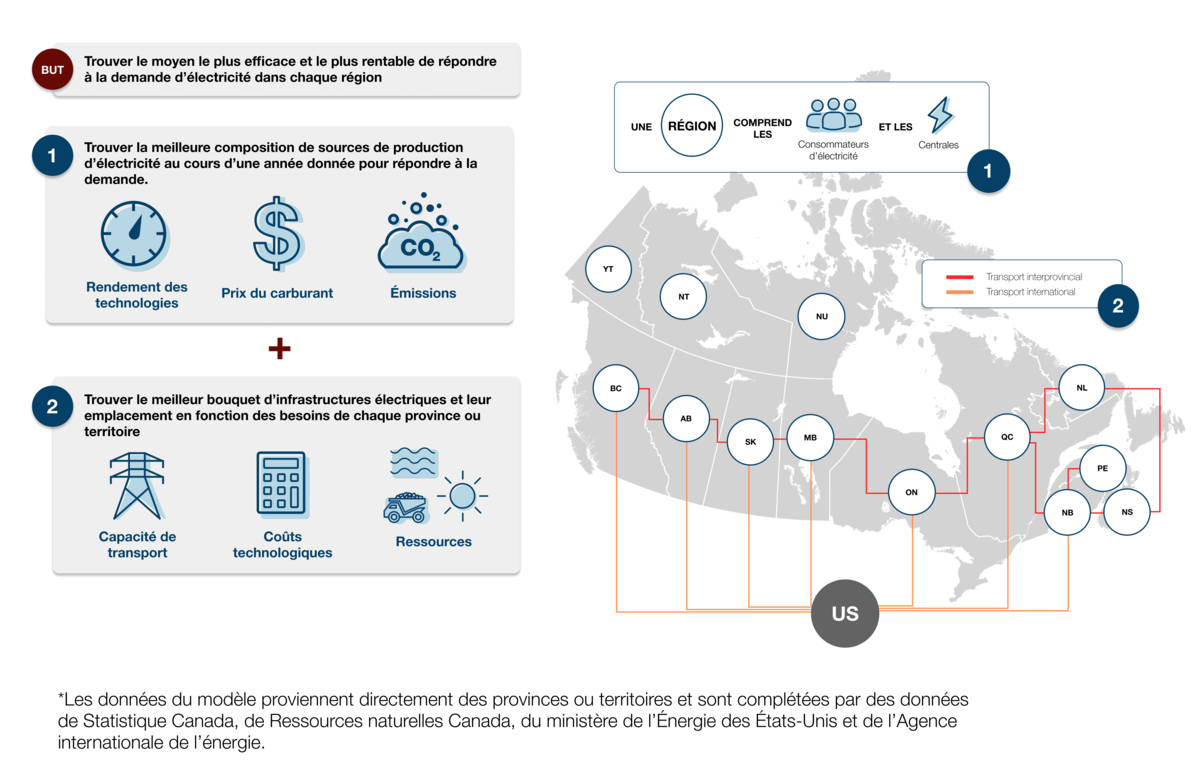 Le modèle de l’offre d’électricité du système de modélisation d’Avenir énergétique simule la façon dont la demande future d’électricité des différents secteurs de l’économie est satisfaite par un amalgame d’unités de production et de réseaux de transport. Pour fournir des projections fiables de l’offre d’électricité au Canada, le modèle simule les activités typiques des réseaux électriques. Il modélise les unités de production et de stockage d’électricité (y compris leurs caractéristiques techniques et économiques), l’infrastructure de transport, la disponibilité des ressources, la demande et les règlements en place.