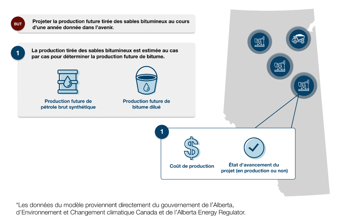 Description : L’infographie illustre de façon simplifiée le modèle servant pour les sables bitumineux, qui vise à projeter la production totale provenant des sables bitumineux au cours d’une année donnée. Cette production est estimée en fonction de chaque projet de manière à connaître la production future de bitume, dont celle de pétrole brut synthétique et celle de bitume dilué. Le modèle ventile ces coûts en regard des coûts de production et de l’état d’avancement du projet (à savoir s’il est en production ou non).