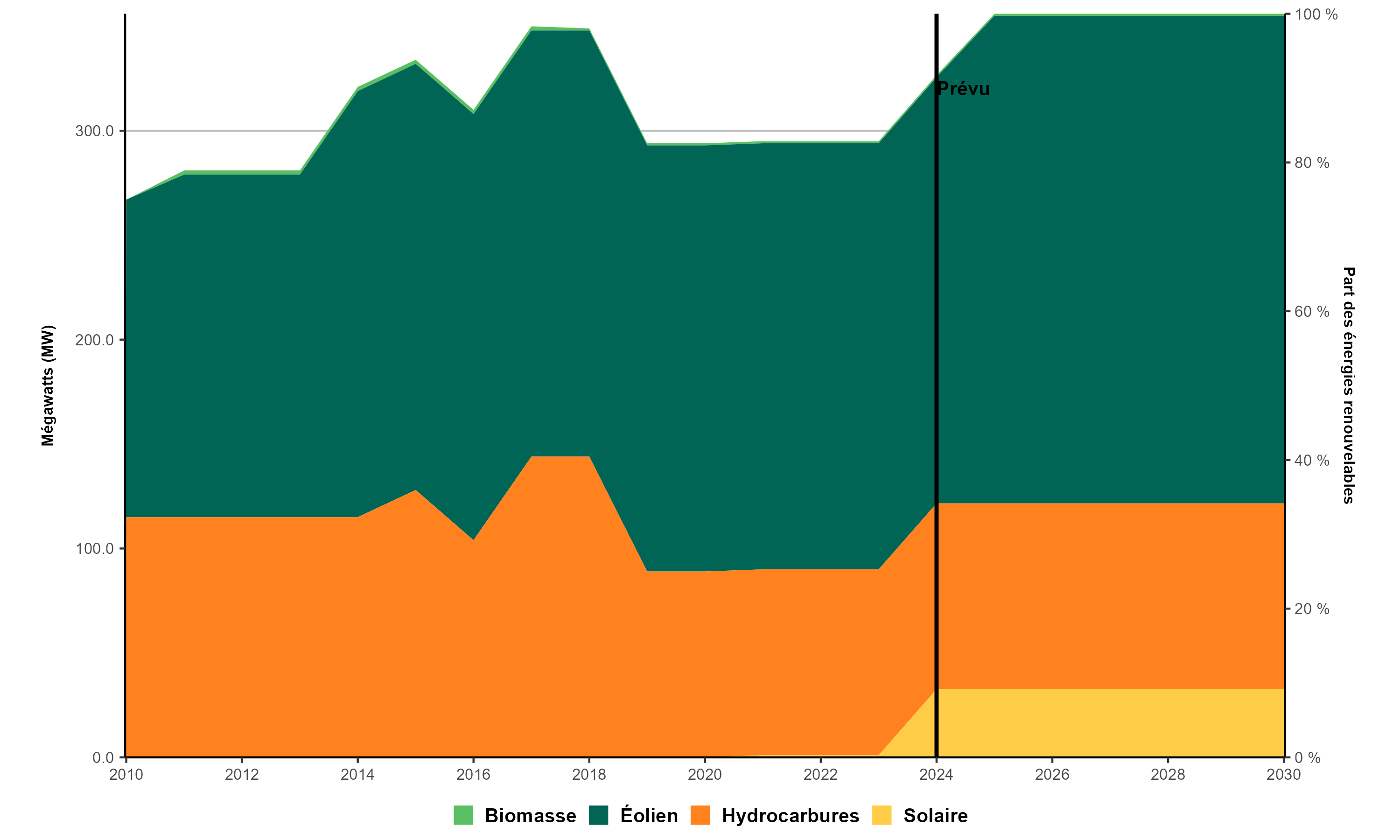 - La capacité de production à partir d’énergies renouvelables est passée de 267 mégawatts (« MW ») en 2010 à 295 MW en 2023, soit une augmentation de 10,5 %. Cette croissance était principalement attribuable à l’éolien (52 MW), tandis que la biomasse et l’énergie solaire sont toutes deux passées de 0 à 1 MW. Au cours de cette période, la capacité des centrales alimentées au pétrole est passée de 115 MW à 89 MW.
