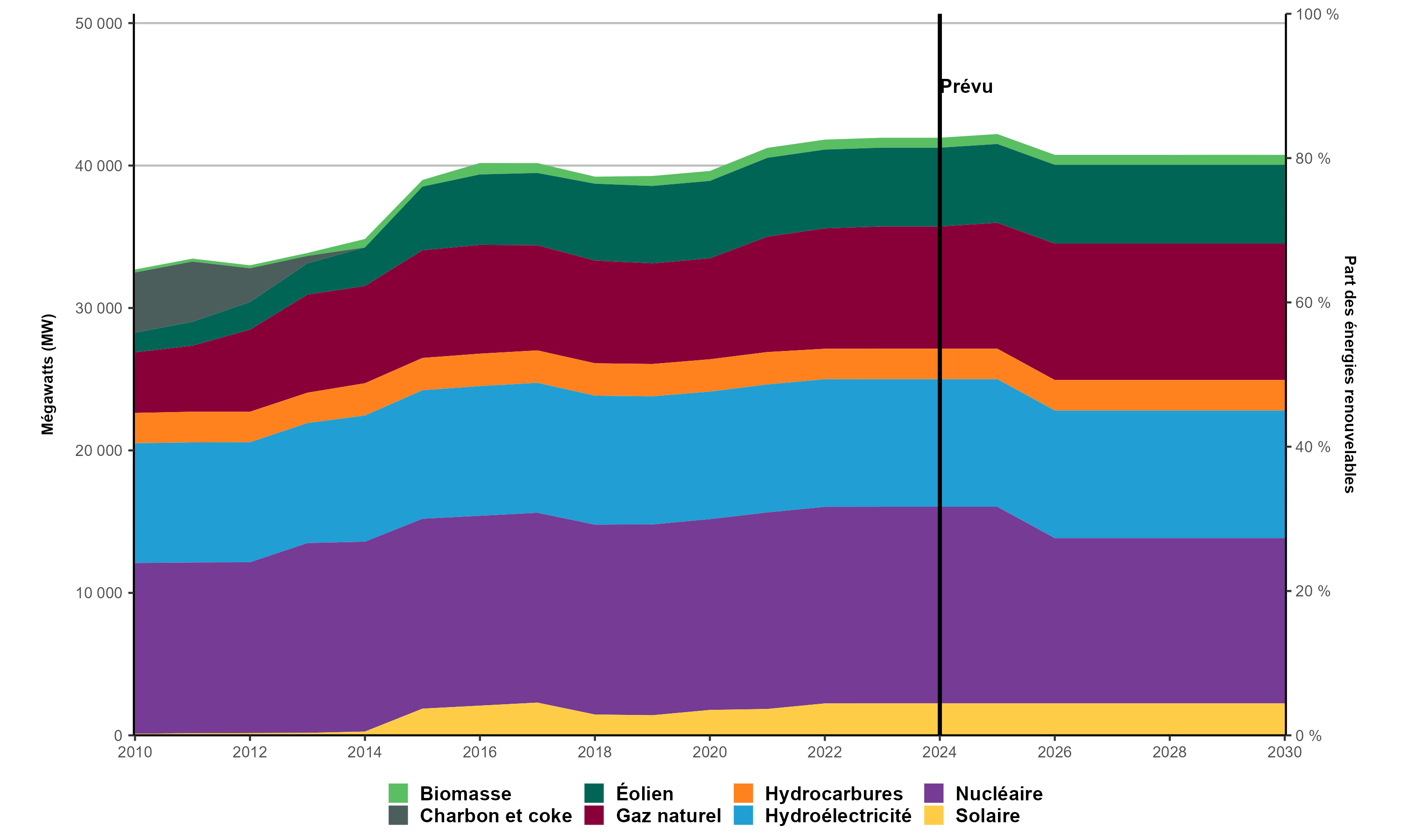 Version texte : Le graphique présente la capacité de production d’électricité en Ontario de 2010 à 2030. En 2010, la capacité installée totale de production d’électricité de la province s’établissait à 32 702 MW, dont 30,9 % à partir d’énergies renouvelables. En 2023, cette capacité avait augmenté pour passer à 41 952 MW (41,6 % provenant d’énergies renouvelables). Selon les ajouts prévus, la capacité devrait atteindre 40 750 MW (42,8 % à partir d’énergies renouvelables) en 2030.