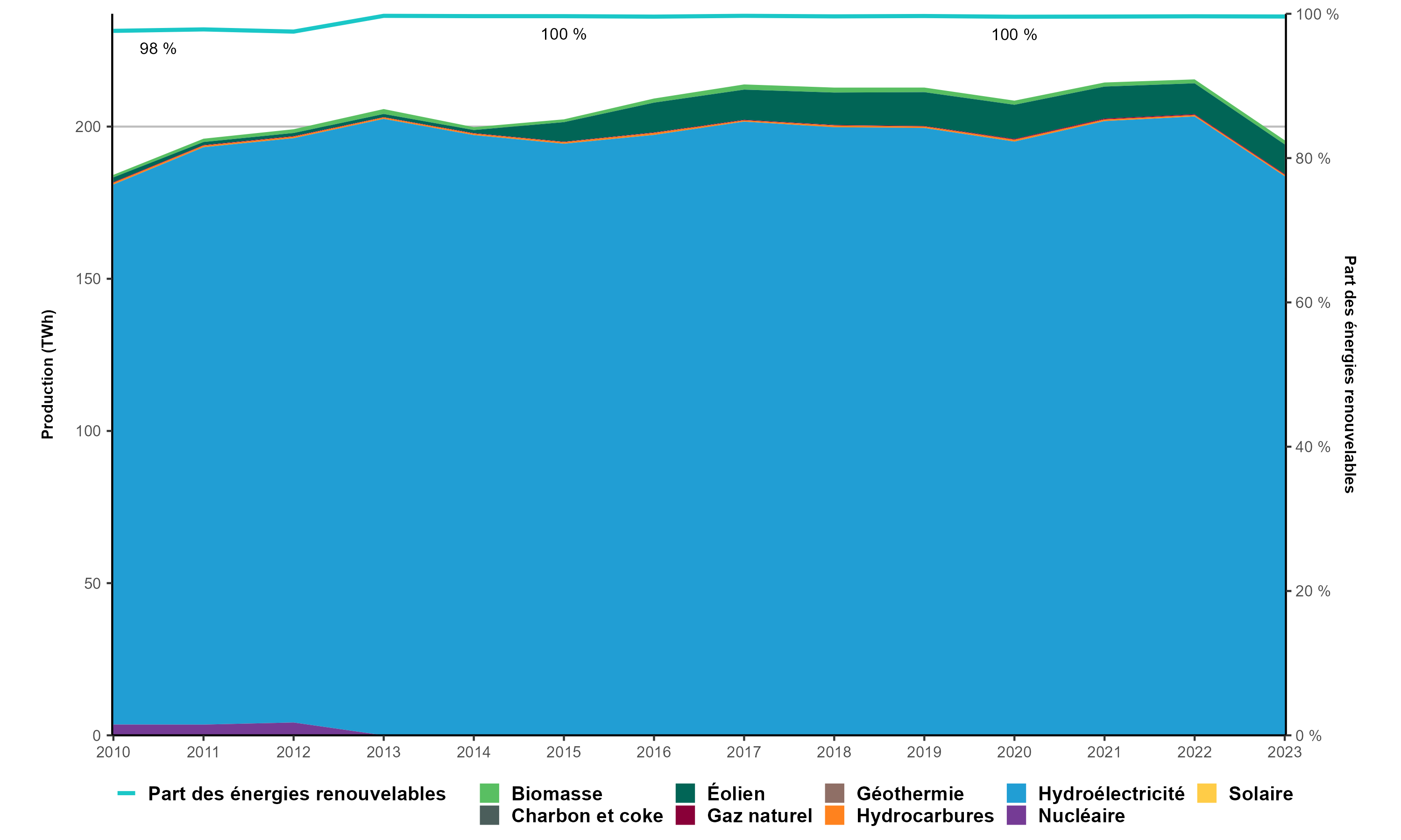 Version texte : Le graphique présente la production d’électricité au Québec de 2010 à 2023. En 2010, la production totale d’électricité du Québec s’établissait à 184,2 TWh, dont 97,6 % à partir d’énergies renouvelables. En 2023, elle atteignait 195,5 TWh (99,6 % provenant d’énergies renouvelables). La même année, la plus grande partie de la production provenait de l’hydroélectricité (94,0 %), de l’éolien (5,0 %) et de la biomasse (0,7 %).