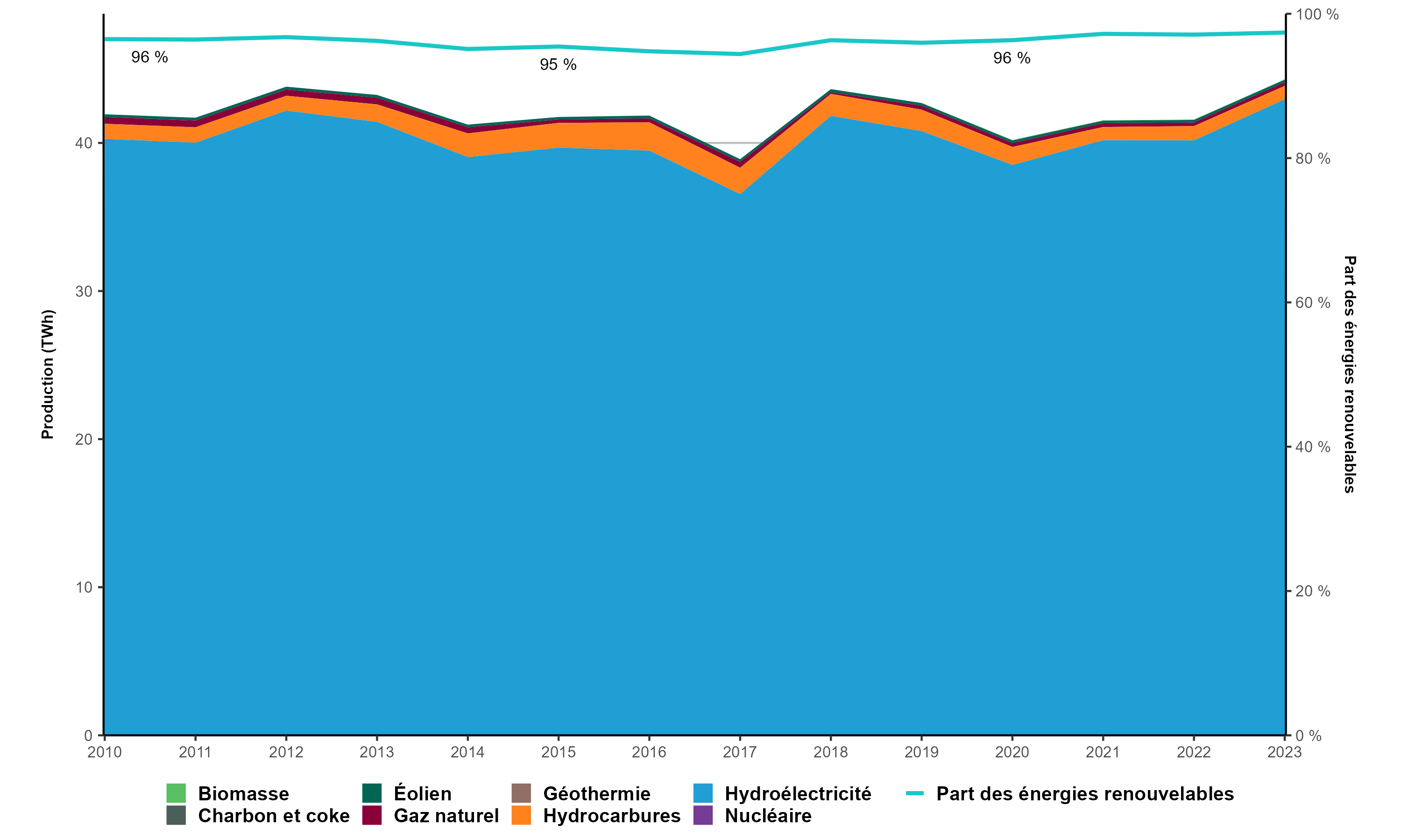 Version texte : Le graphique présente la production d’électricité à Terre-Neuve-et-Labrador de 2010 à 2023. En 2010, la production totale d’électricité de Terre-Neuve-et-Labrador s’établissait à 41,9 TWh, dont 96,5 % à partir d’énergies renouvelables. En 2023, elle atteignait 44,3 TWh (97,4 % provenant d’énergies renouvelables). La même année, la plus grande partie de la production provenait de l’hydroélectricité (97,0 %), du pétrole (2,1 %) et du gaz naturel (0,6 %).