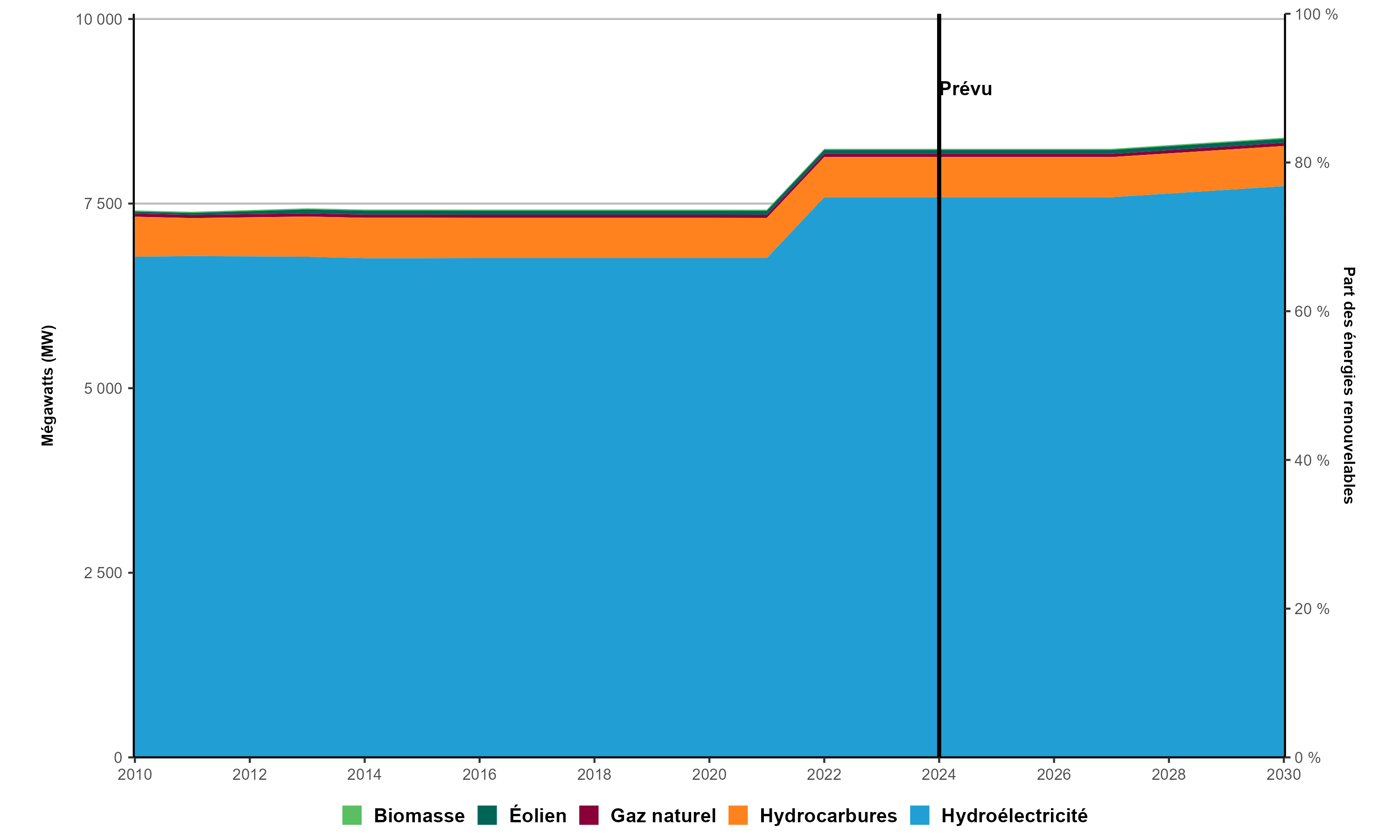 • La capacité de production à partir d’énergies renouvelables est passée de 6 823 mégawatts (« MW ») en 2010 à 7 655 MW en 2023, soit une augmentation de 12,2 %, principalement attribuable à l’hydroélectricité (824 MW) et à l’éolien (27 MW).