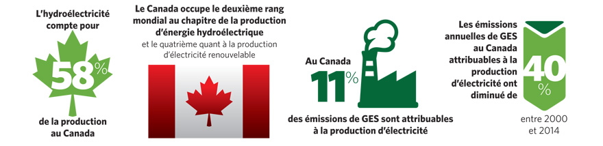 La production d’énergie renouvelable du Canada place le pays au quatrième rang mondial. À ce chapitre, c’est l’hydroélectricité qui domine, représentant presque 60 % de la puissance installée et de la production au pays.