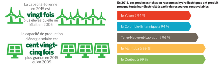 En dépit de diverses politiques et de programmes variés à l’appui des énergies renouvelables, au Canada, les ajouts à la capacité de production ont été limités du fait d’une faible croissance de la demande d’électricité et de la longue durée de vie utile des installations déjà en place. Il a aussi fallu composer avec des préoccupations quant aux coûts et de l’opposition à l’échelle locale.