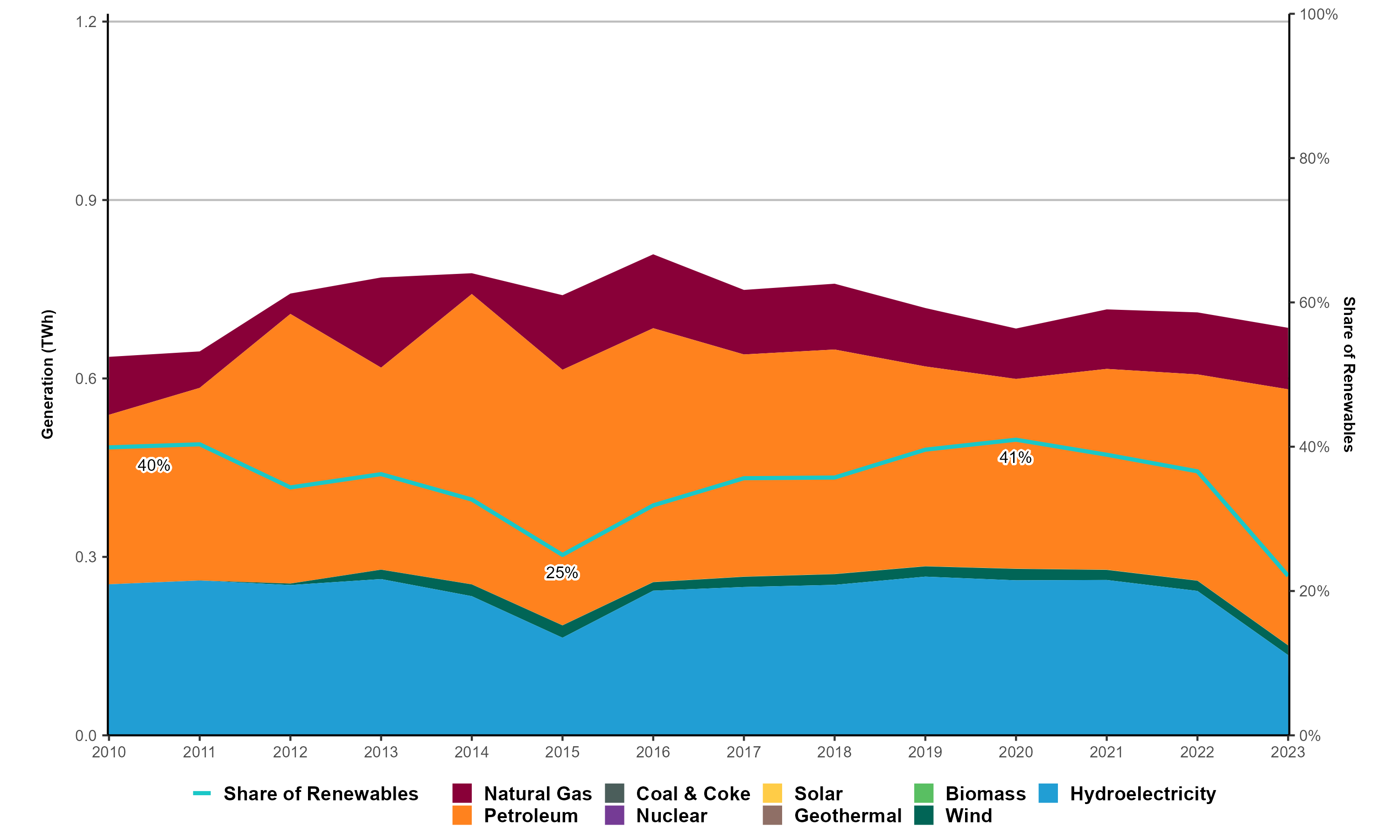 Lower-than-average (based on data from the last 20 years) water levels in recent years reduced hydroelectric outputFootnote 2Footnote 3. In 2023, hydroelectricity supplied 134.8 GWh, or 19.7% of total generation, down from typical levels, leading to increased reliance on petroleum-fired generation by electrical utilities.