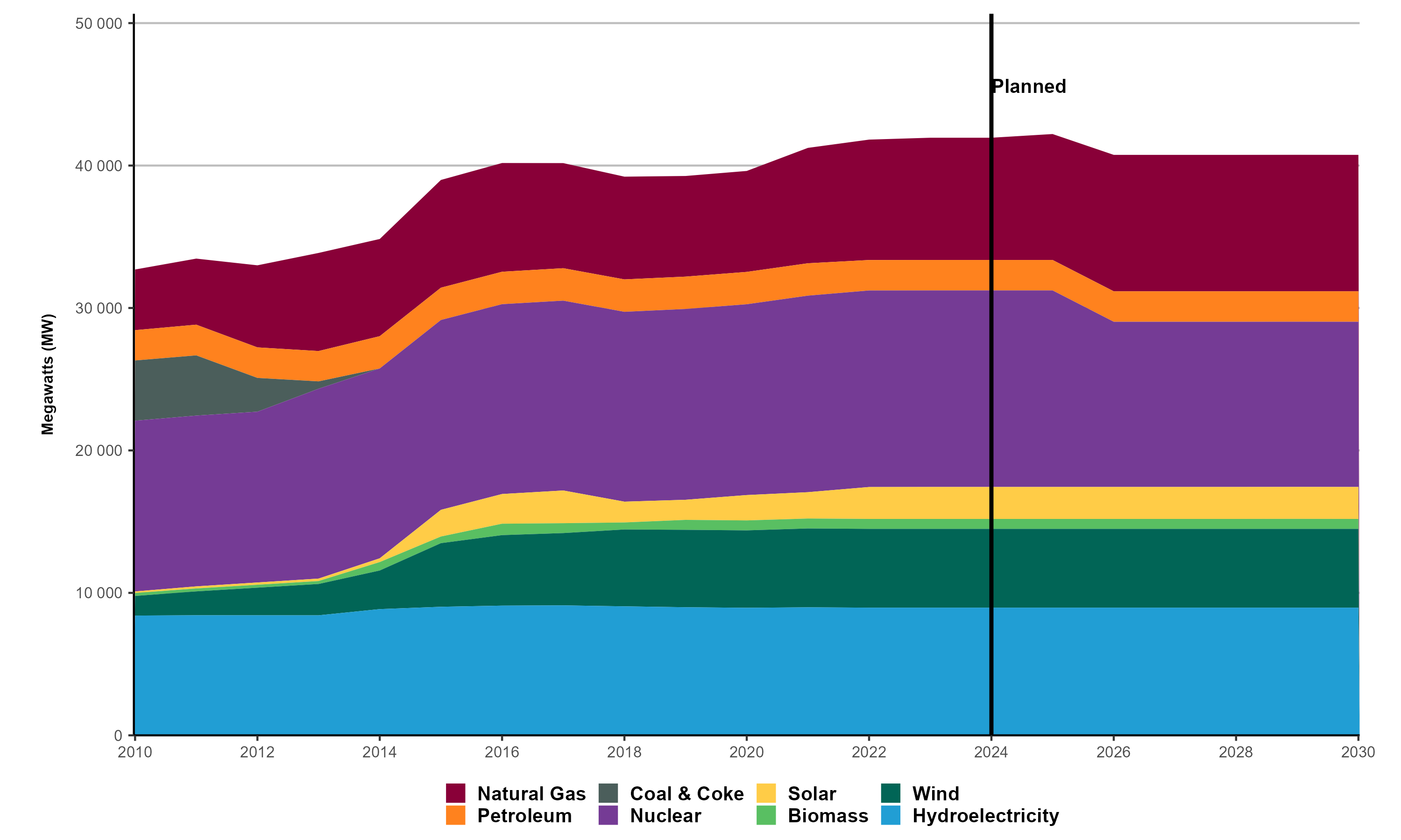 Figures 1 and 2 show historical trends in generation and installed capacity, respectively. Figure 2 also includes planned capacity additions for 2024–2030. The planned portion of the figure may be conservative; additional projects could be announced and come online before 2030, and some projects in the outlook might not proceed.