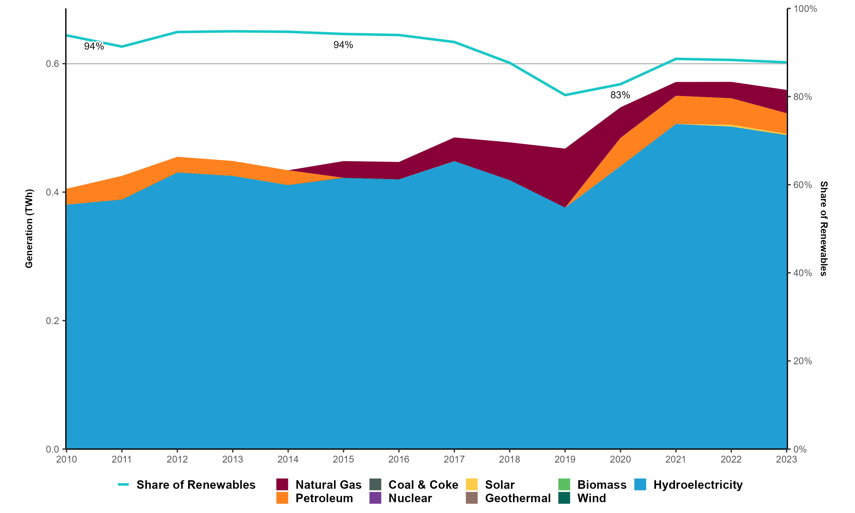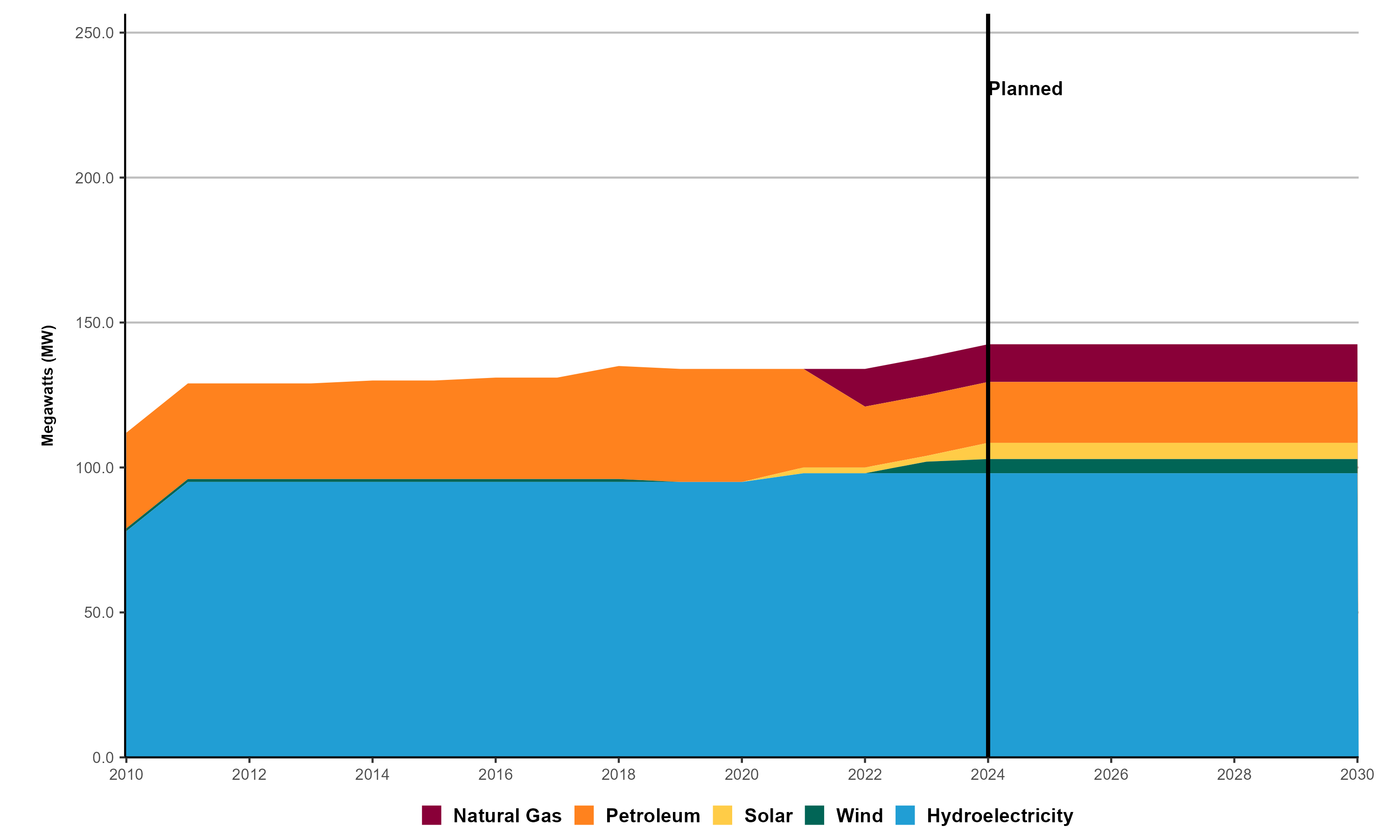 - Renewable capacity grew from 79 megawatts (MW) in 2010 to 104 MW in 2023, a 31.6% increase. Most of this growth came from hydroelectricity (20 MW), wind (3 MW) and solar (2 MW).