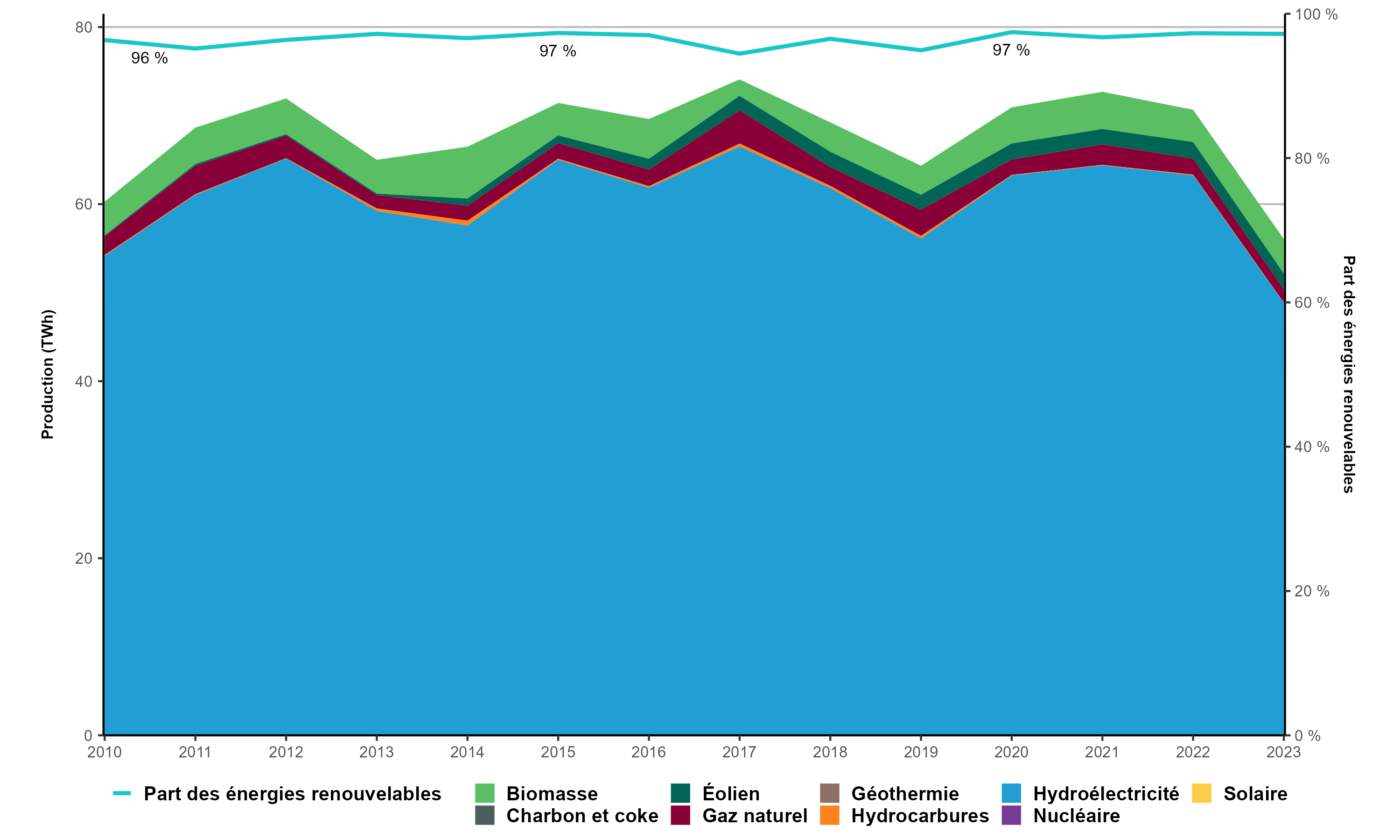 Version texte : Le graphique présente la production d’électricité en Colombie-Britannique de 2010 à 2023. En 2010, la production totale d’électricité de la province s’établissait à 60,3 TWh, dont 96,4 % à partir d’énergies renouvelables. En 2023, elle atteignait 56,1 TWh (97,2 % provenant d’énergies renouvelables). La plus grande partie de la production provient de l’hydroélectricité, suivie de la biomasse, du gaz naturel et de l’éolien.