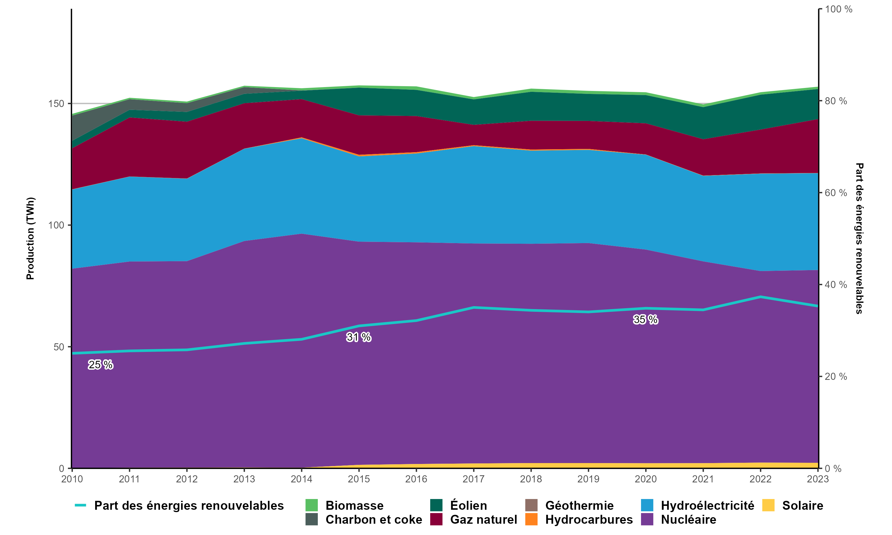 Version texte : Le graphique présente la production d’électricité en Ontario de 2010 à 2023. En 2010, la production totale d’électricité de l’Ontario s’établissait à 145,7 TWh, dont 25,0 % à partir d’énergies renouvelables. En 2023, elle atteignait 156,9 TWh (dont 35,3 % provenant d’énergies renouvelables). La même année, la plus grande partie de la production provenait du nucléaire (50,5 %), de l’hydroélectricité (25,4 %), du gaz naturel (14,1 %), de l’éolien (7,9 %) et du solaire (1,4 %).
