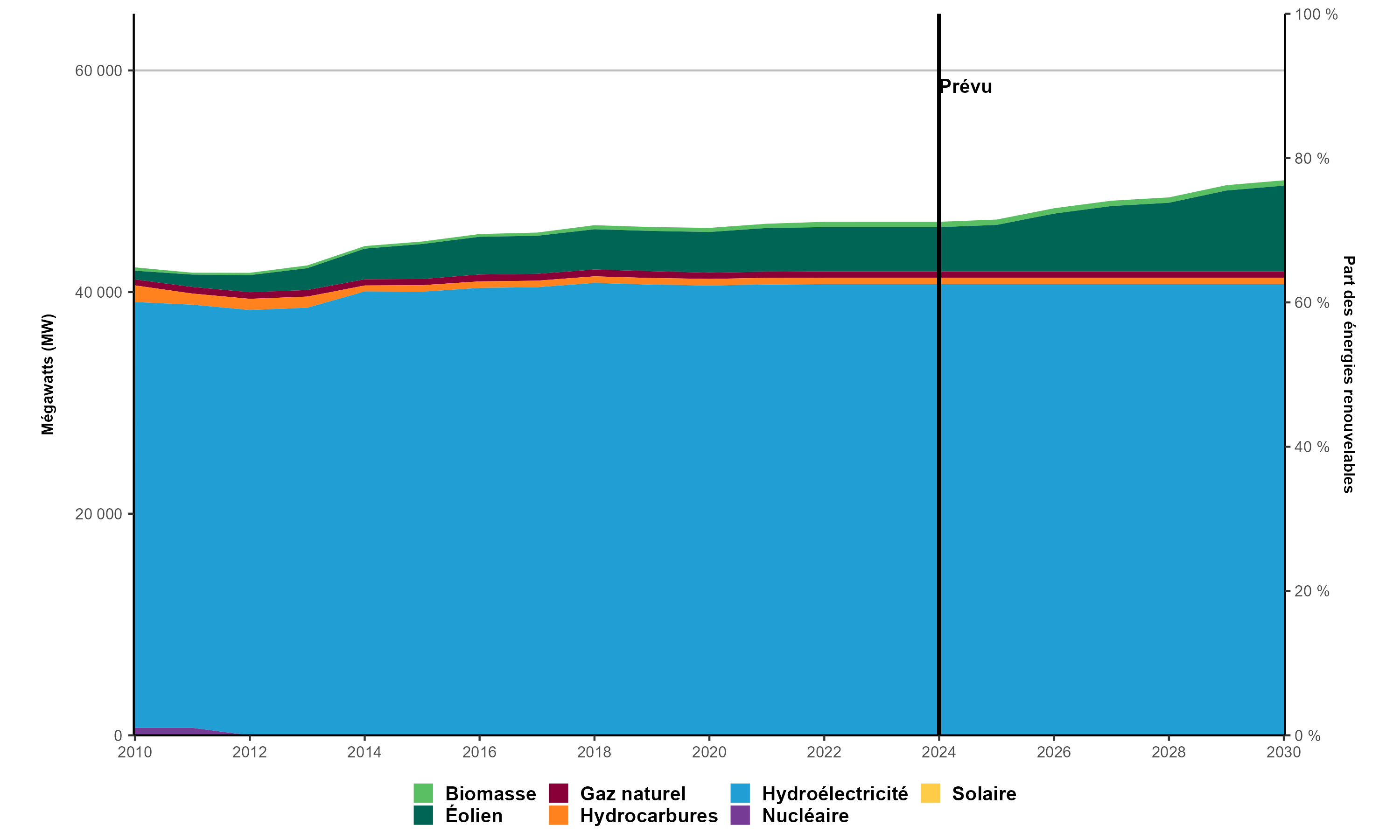 Version texte : Le graphique présente la capacité de production d’électricité au Québec de 2010 à 2030. En 2010, la capacité installée totale de production d’électricité de la province s’établissait à 42 230 MW, dont 94,0 % à partir d’énergies renouvelables. En 2023, cette capacité avait augmenté pour passer à 46 343 MW (97,5 % provenant d’énergies renouvelables). Selon les ajouts prévus, la capacité devrait atteindre 50 088 MW (97,7 % à partir d’énergies renouvelables) en 2030.